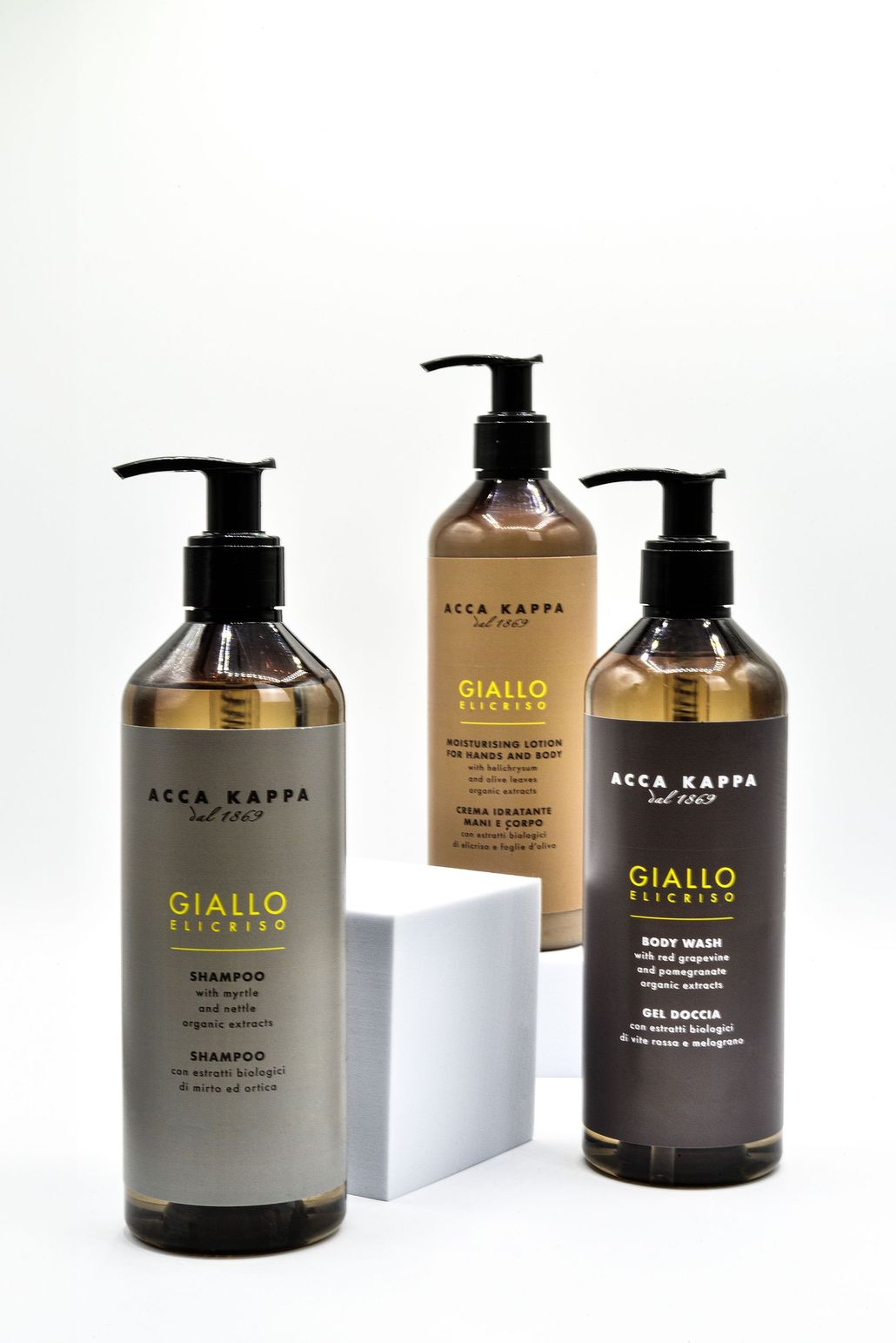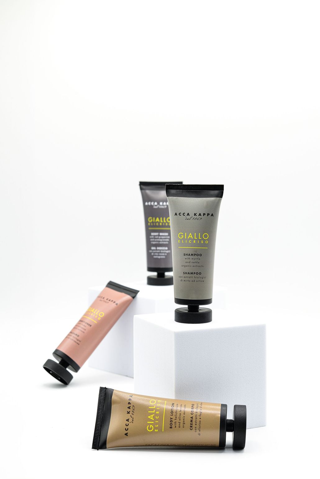 Dalla gamma di profumi Giallo Elicriso nasce il desiderio di creare una linea amenities caratterizzata da una profumazione raffinata. Una miscela armoniosa di note dolci e sensuali di legno chiaro, ambra e muschio.