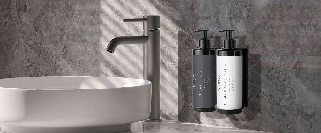 Il design si adatta ad ogni tipo di struttura alberghiera. Il contrasto del grigio e del bianco, arricchiti con dettagli in argento a caldo, donano eleganza e stile. Il tappo flip-top regala la massima praticità.