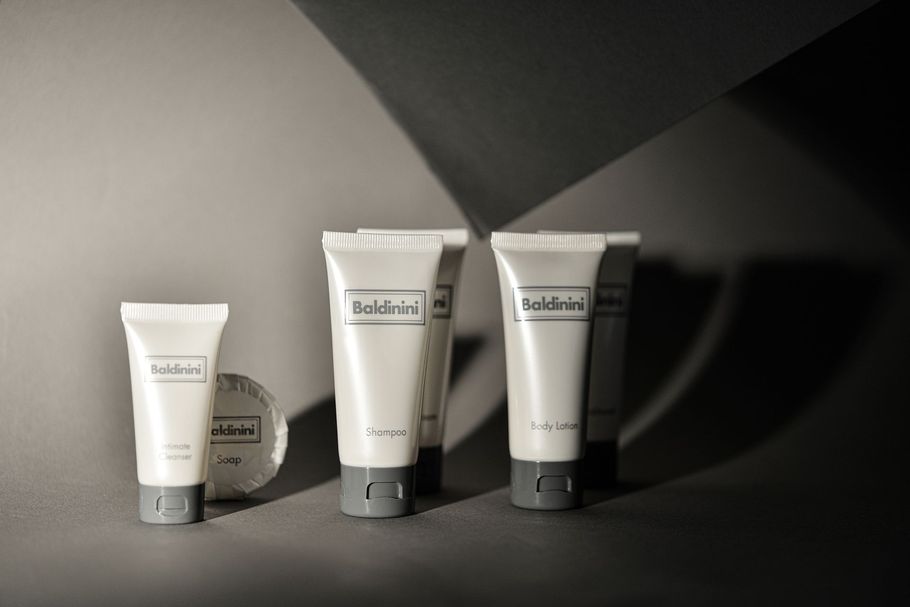 Preziosi tubi in PVC oxo-degradabile con finitura madreperlata, tappo flip-top orientato e sigillo di garanzia. Bagnoschiuma e Shampoo rivelano note di Corteccia, mentre il Miele è il protagonista nel balsamo; crema corpo e sapone avvolgeranno i vostri ospiti con l'essenza di Rosa. Completa la linea un importante astuccio anch'esso madreperlato, con tutto l'occorrente per l'igiene personale e una particolare attenzione all'ambiente: accessori e confezioni sono plastic free. Baldinini è riconosciuto in tutto il mondo come un'icona di stile dal carattere italiano: qualunque sia la provenienza dei vostri ospiti, non potranno non riconoscere ed apprezzare la sua presenza nelle camere del vostro Hotel.